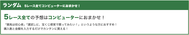WIN5のランダムとは、指定された5レースそれぞれで1着馬を当てるWIN5の買い方の1つで、5レースすべての予想をコンピューター予想に任せる買い方。