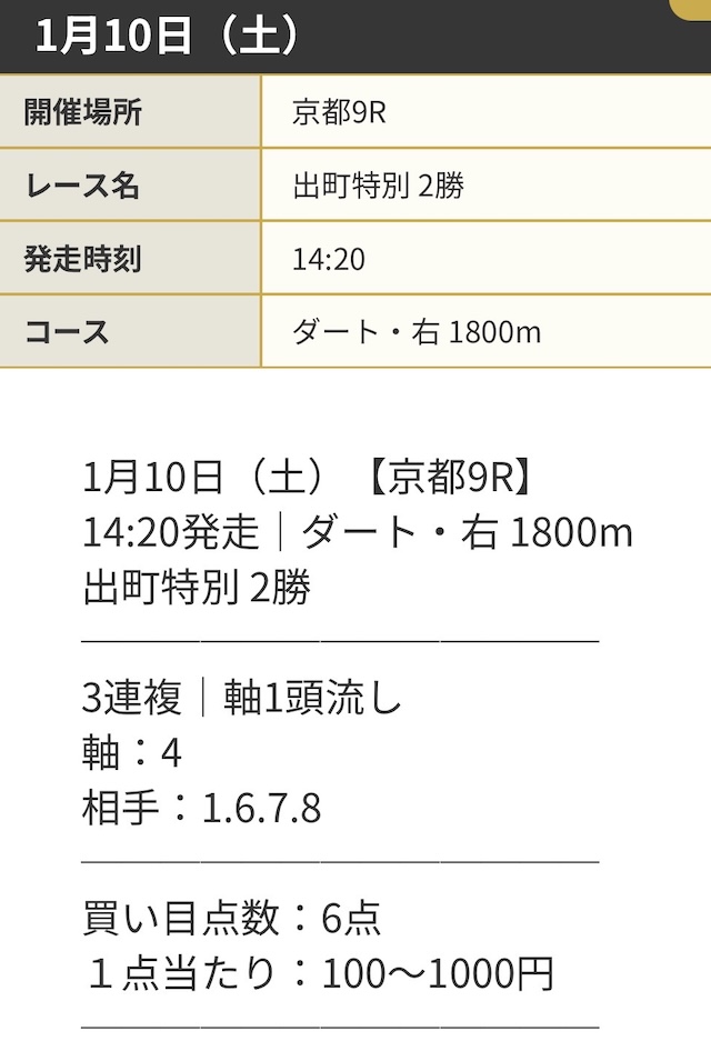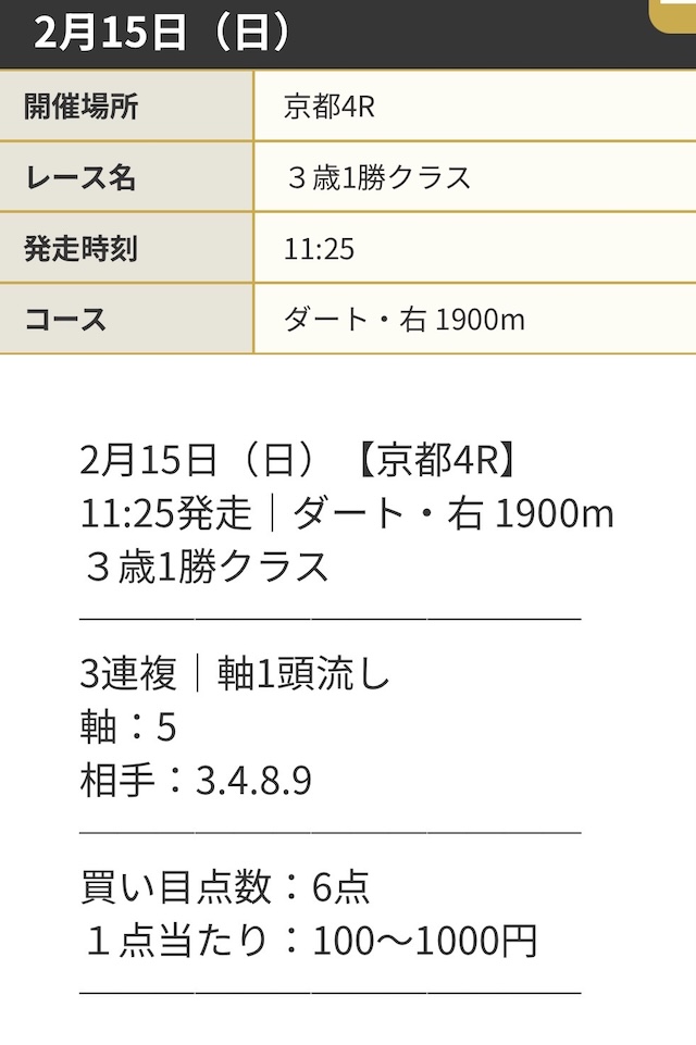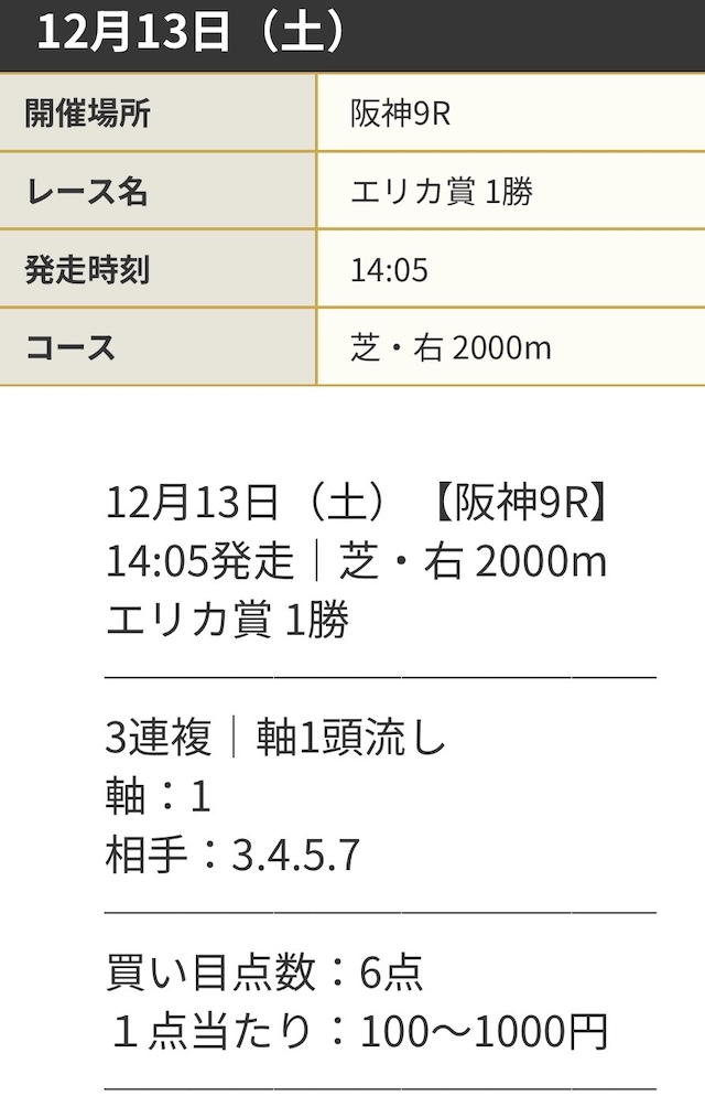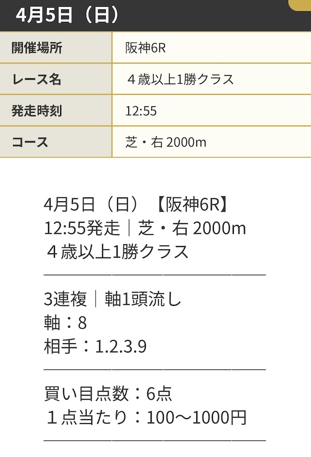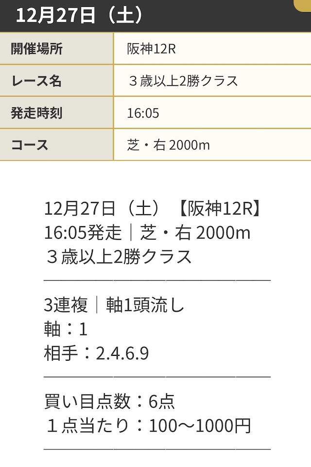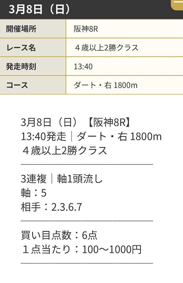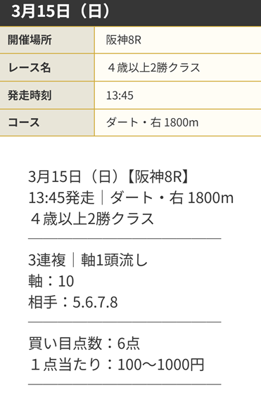 | 推奨馬券代 | 1点100円~1,000円 |