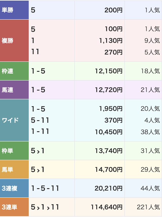 3頭とも買い目に含めていたものの、軸馬である⑪シタバンツが5着となってしまいました。