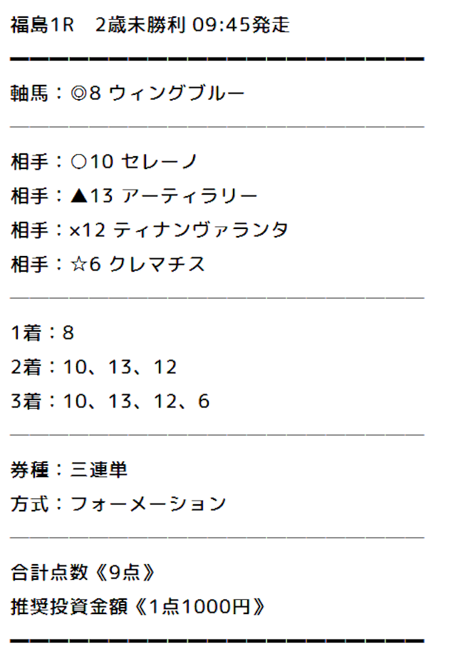 | 推奨馬券代 | 1点100円〜 |