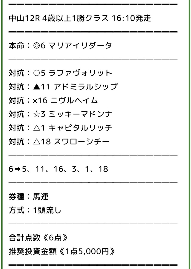無料情報で中山12Rが馬連的中して11万2200円。