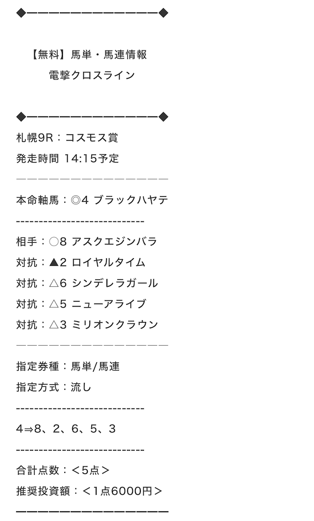 土曜の雷撃クロスライン、点数少ないのに的中して利益。競馬って本来こうあるべきなんだなって思いました。無駄打ち減らせるのは本当にありがたい。週末はまたこの情報に注目です。
