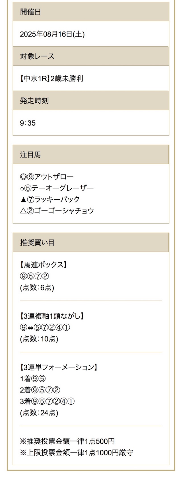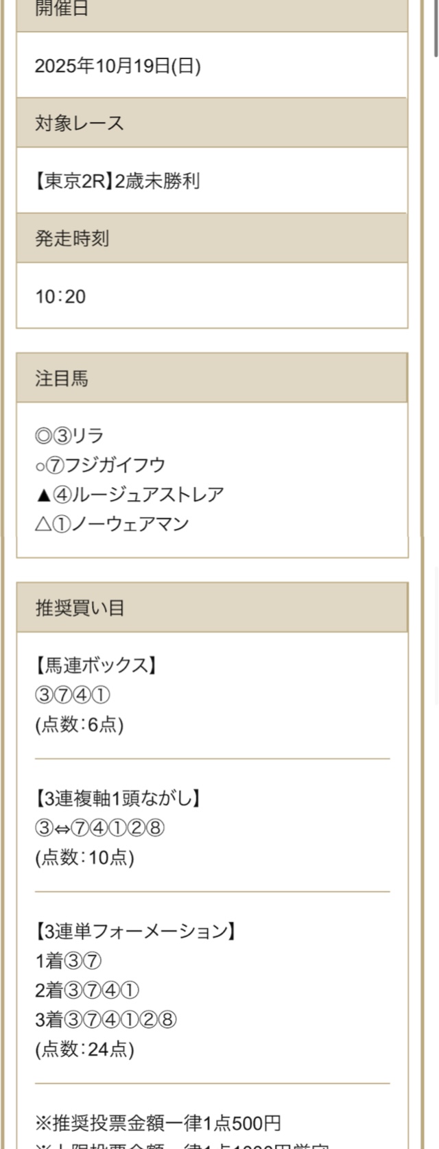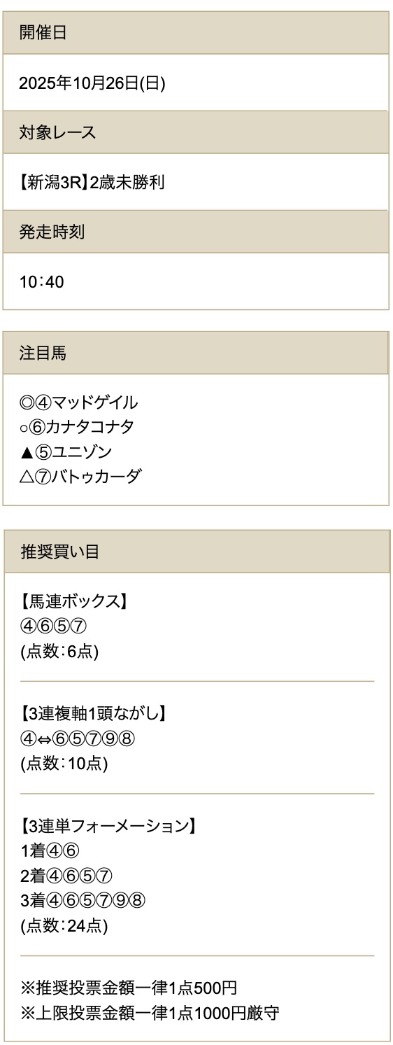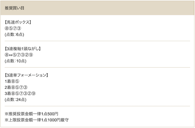| 推奨馬券代 | 1点500円~ |
