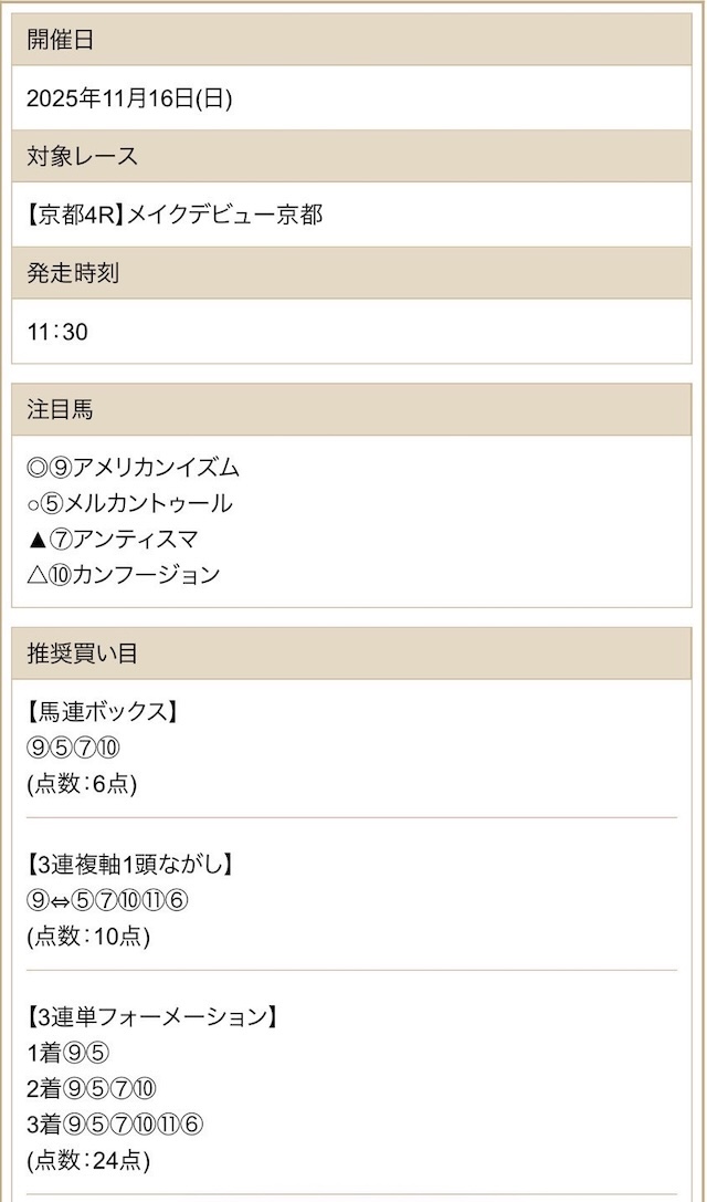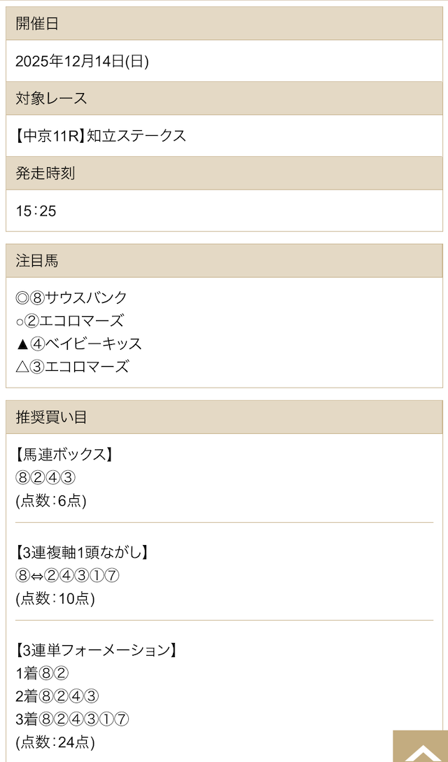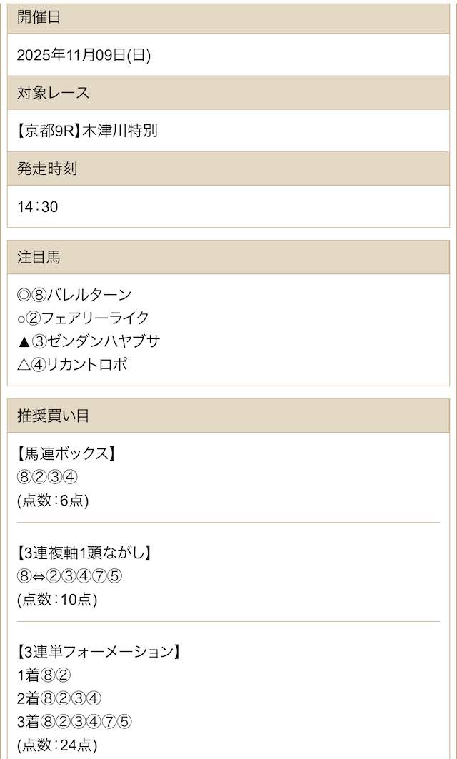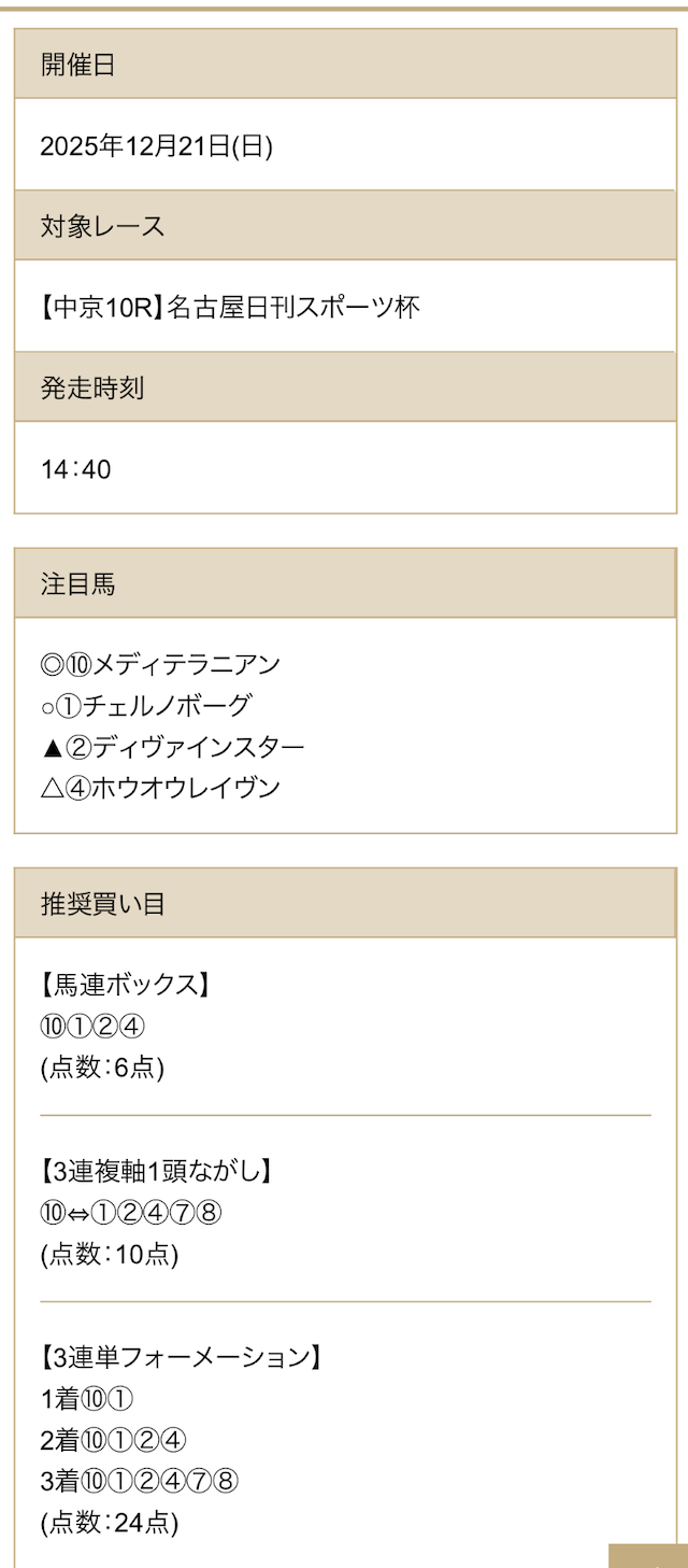 続いて、AI予想・競馬新聞の買い目を確認していきましょう。