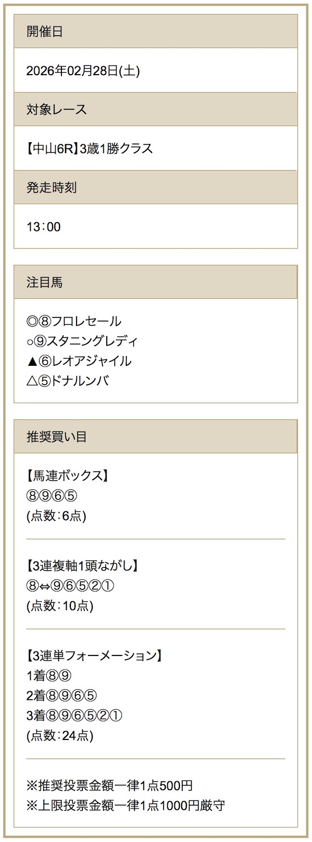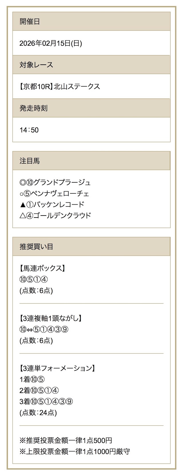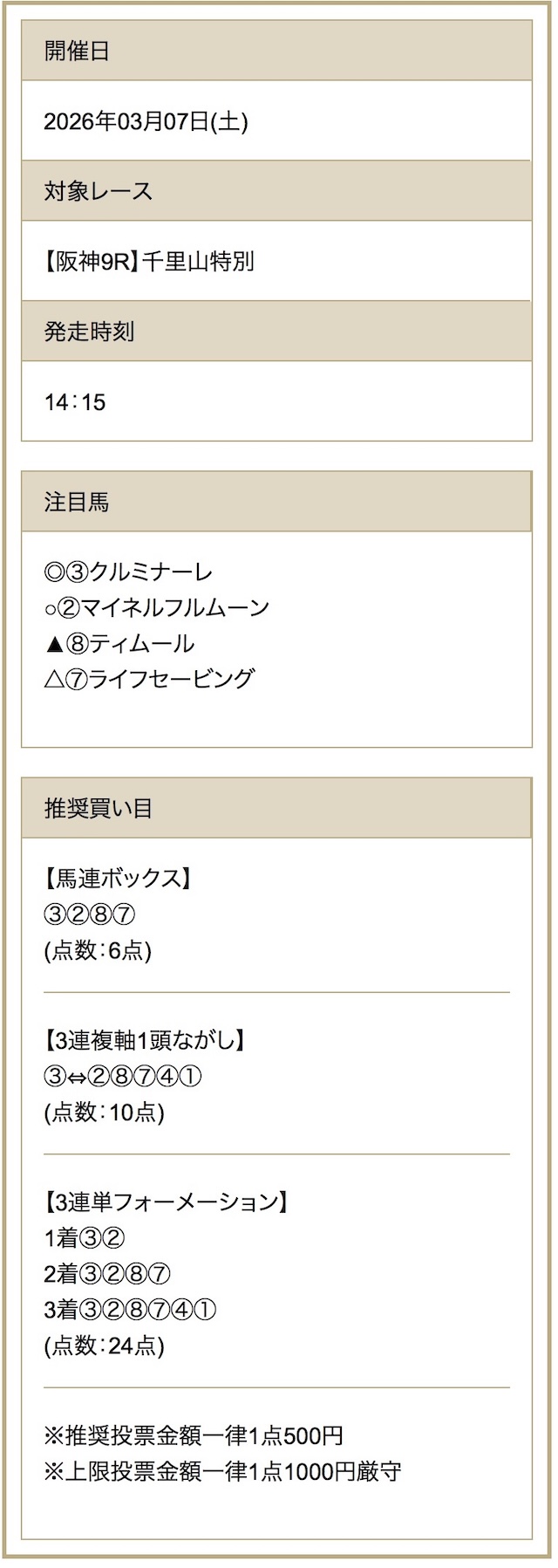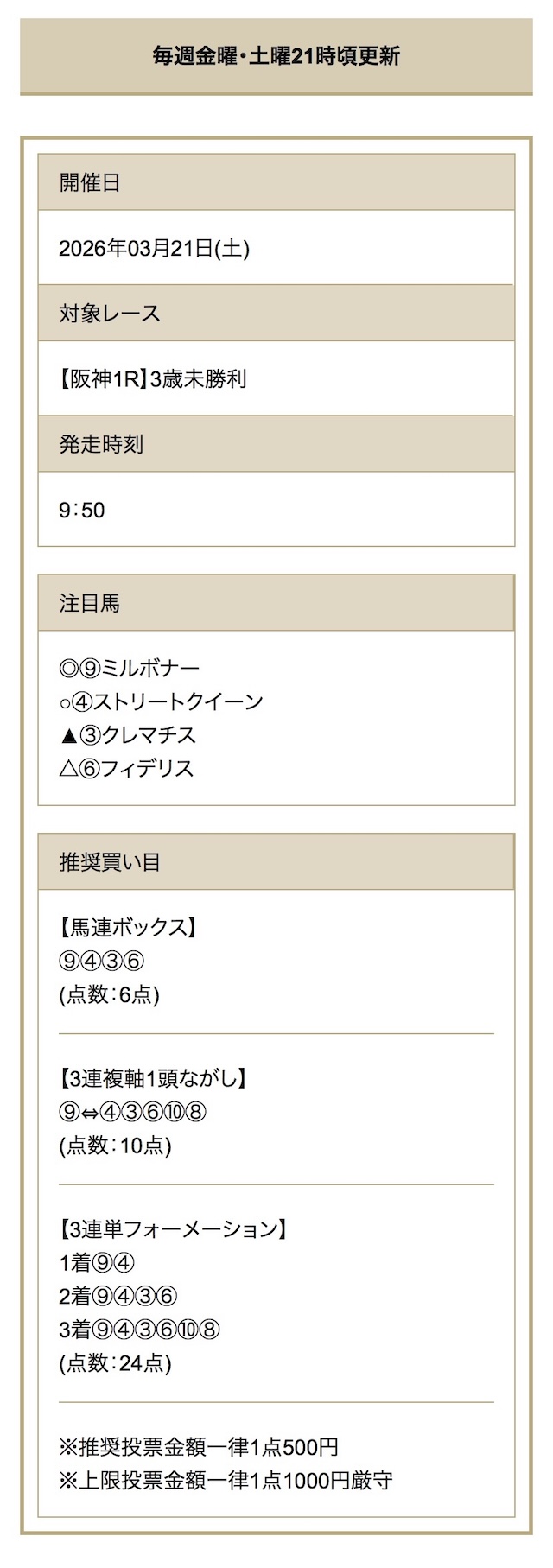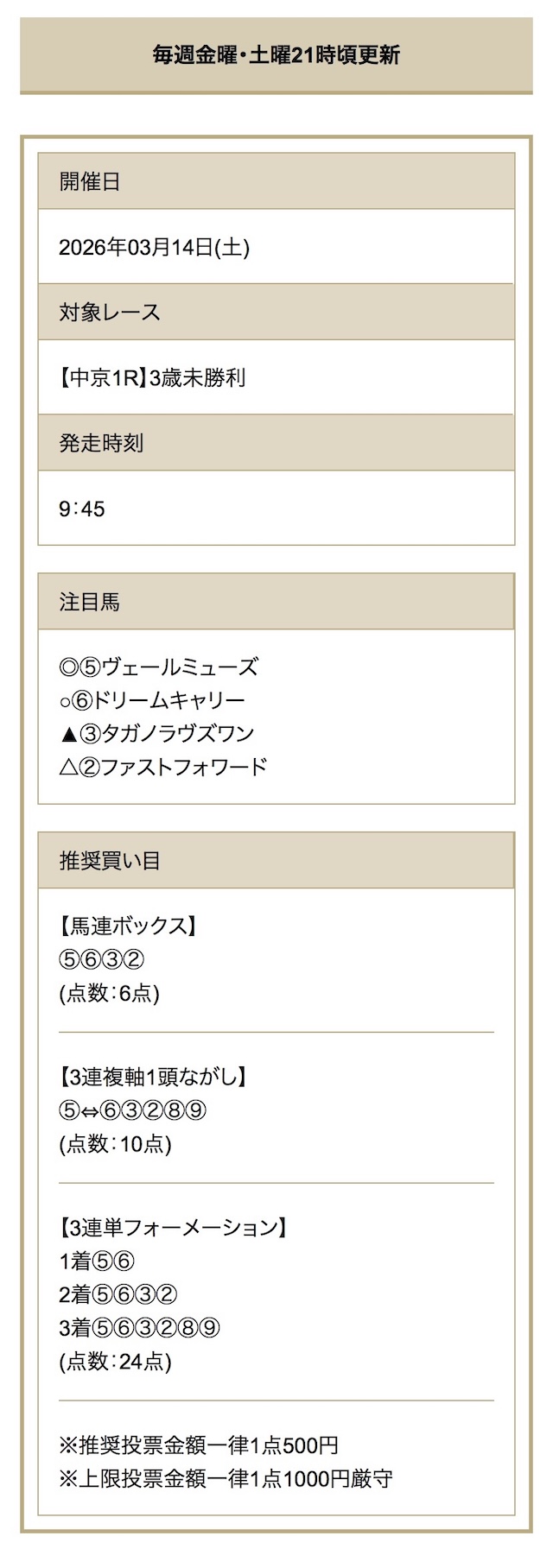 | 予想の確認方法 | 会員ページの[厳選無料情報] |