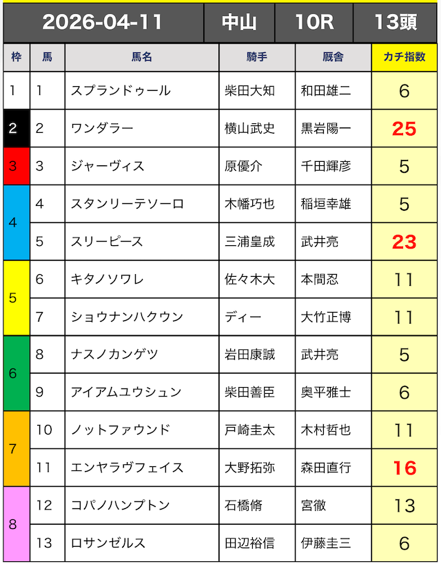 7番人気である⑬チザルビーノなどを選出しているものの、基本的には上位人気馬を中心に選出。