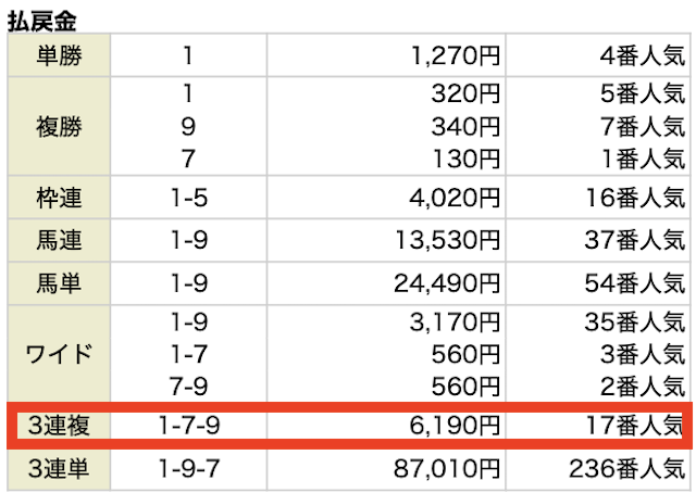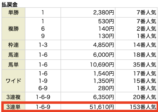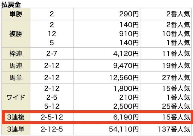 軸は2,7番人気とかなり強気な予想で、更に点数は脅威のわずか6点。