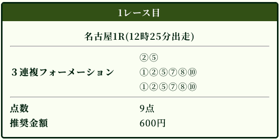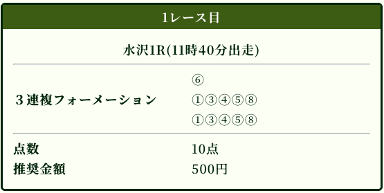 競馬ナンバー1から提供された買い目と、出走する馬の詳細をご覧ください。