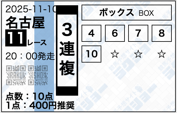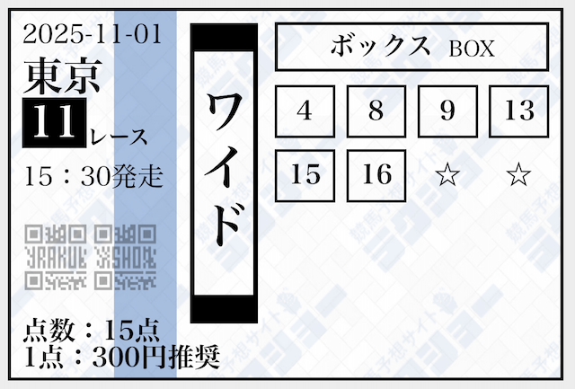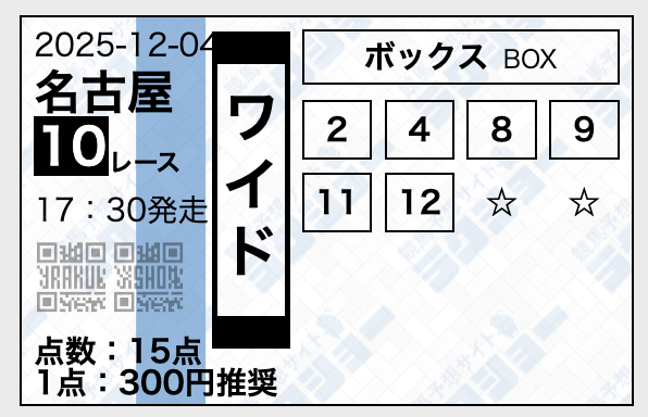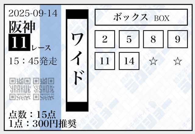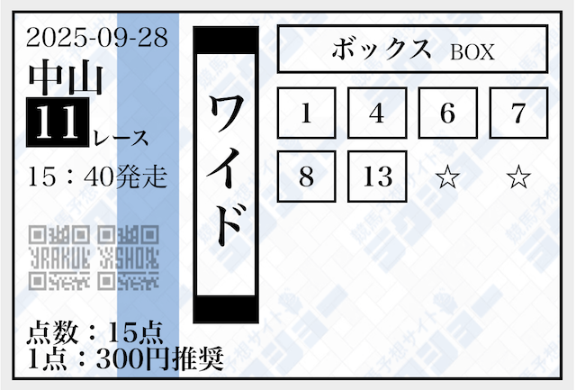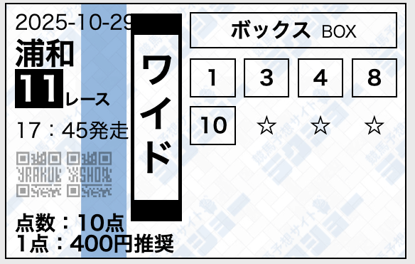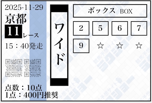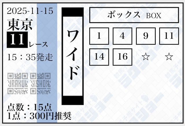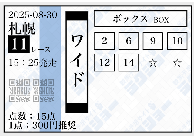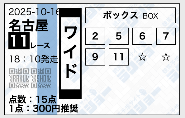ラクショーから提供された買い目と、出走する馬の詳細をご覧ください。