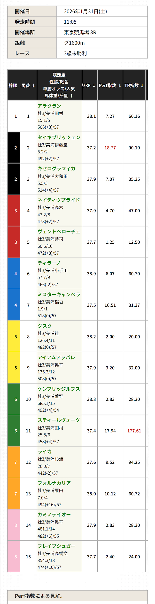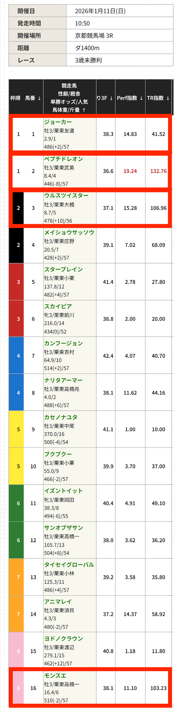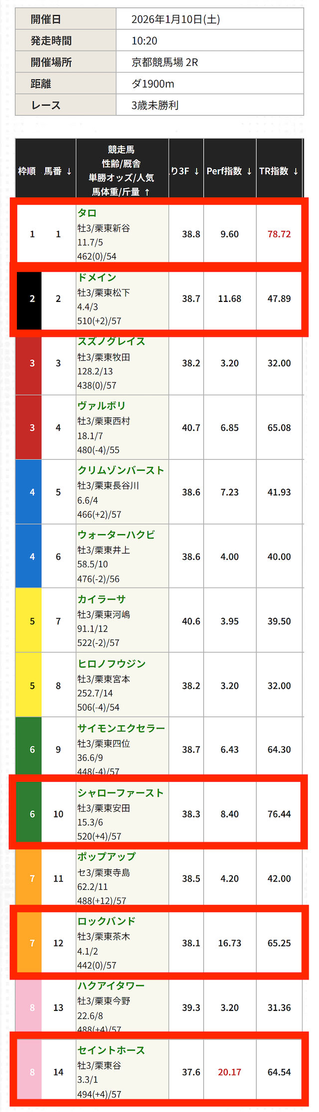 Perf指数・TR指数それぞれで数値上位の3頭をワイドBOXで購入し検証していきます。