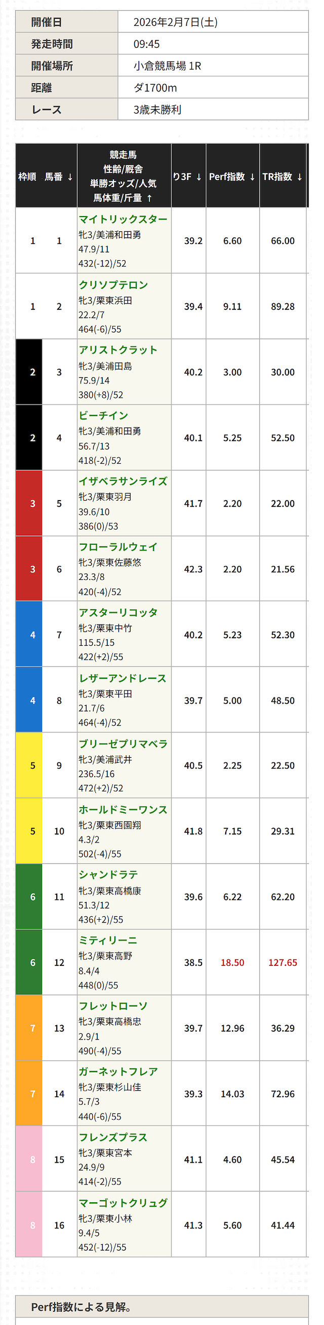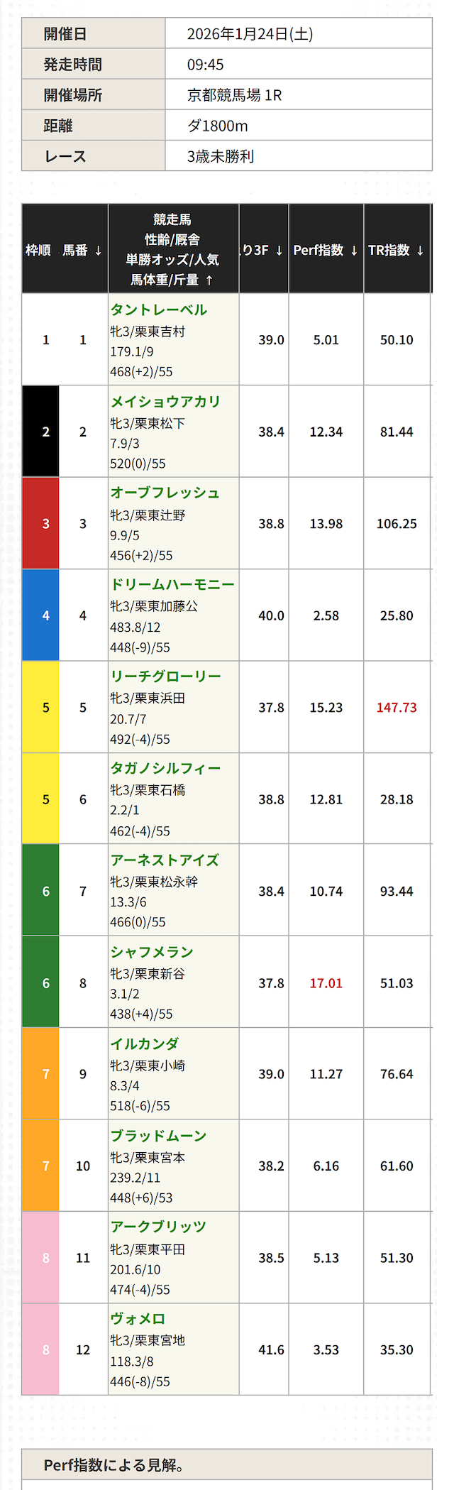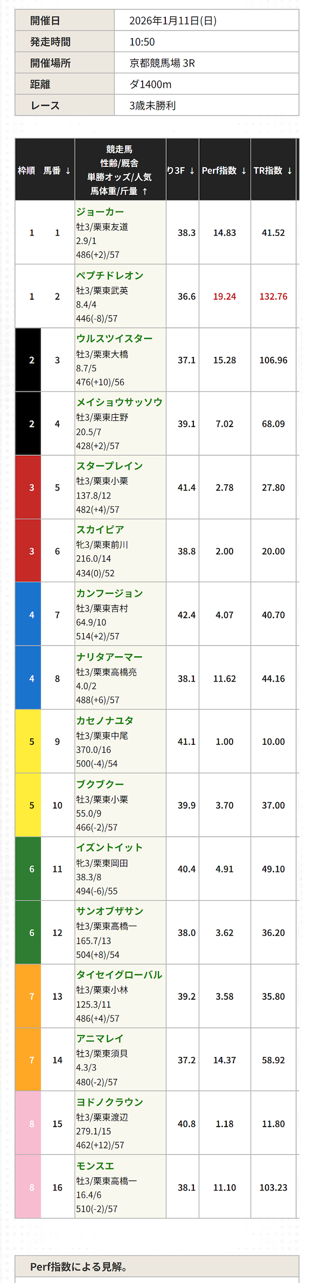 Perf指数・TR指数それぞれで数値上位の3頭をワイドBOXで購入し検証していきます。