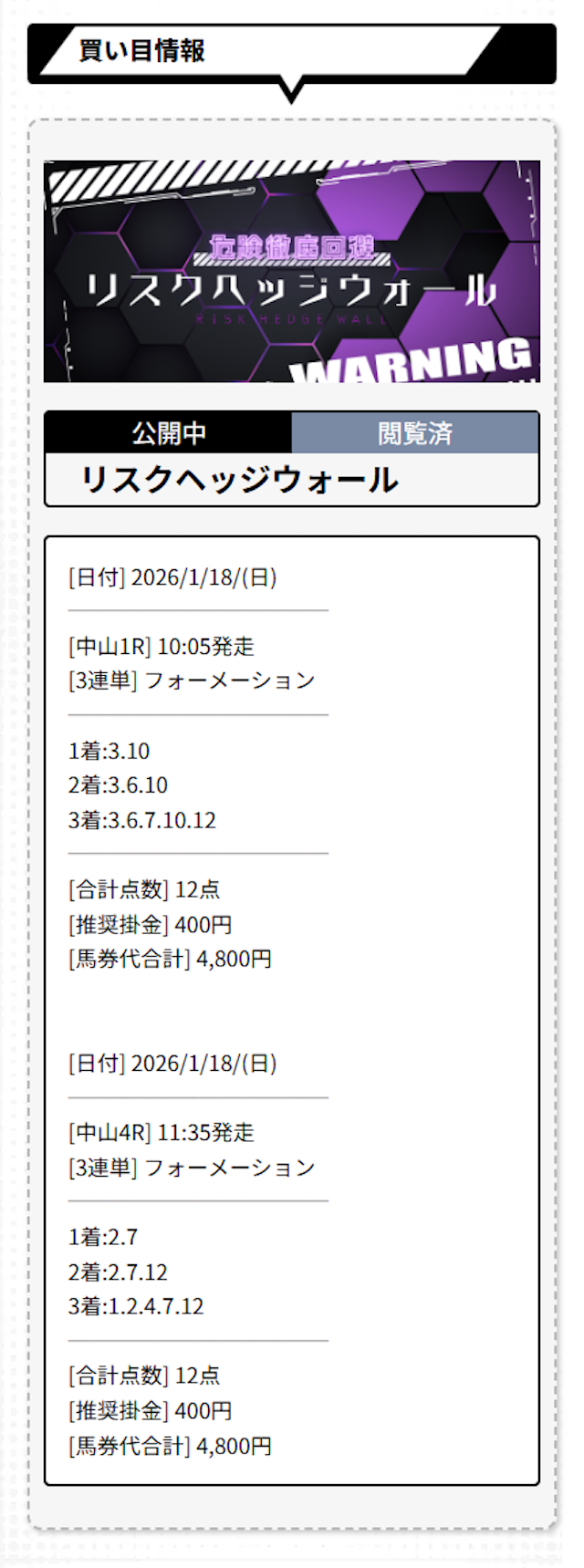 [リスクヘッジウォール]2026年1月18日の中山1R,4Rに参加!