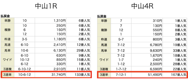 中山1Rでは317.4倍、中山4Rでは514.9倍を読み切り、合わせて332,920円の払戻金を獲得することができました。