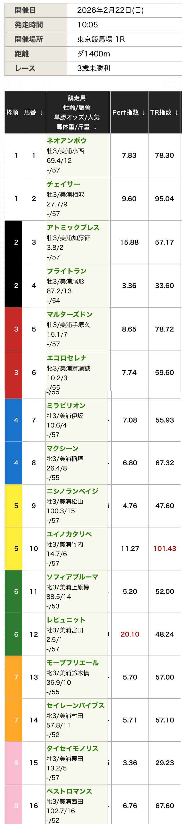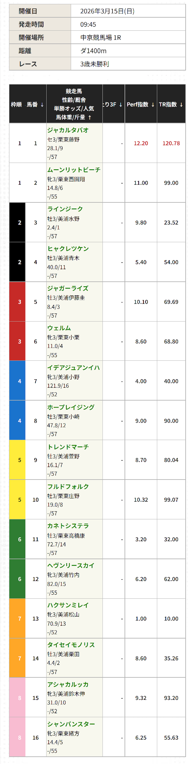 - Perf指数の上位3頭は⑭⑮⑯