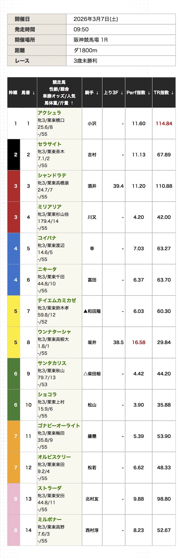 - TR指数の上位3頭は④⑥⑯