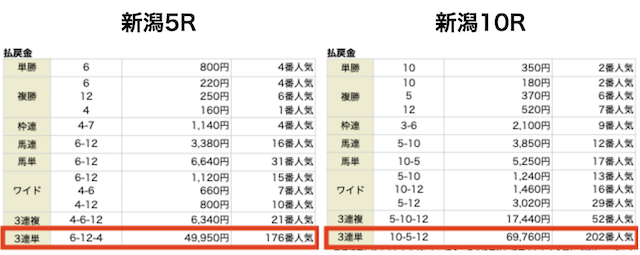 新潟5Rでは3連単499.5倍、新潟10Rでは697.6倍を読み切り、計478,840円の払戻金を獲得することができました!