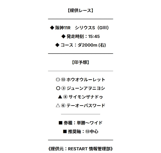 無料予想では圧巻の成績を収めたリスタートですが、果たして有料予想でも満足のいく結果を得ることはできるのでしょうか。