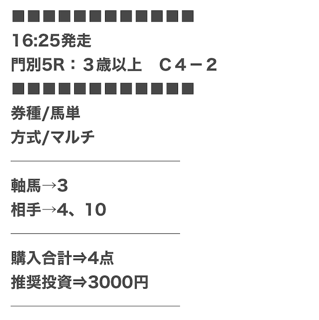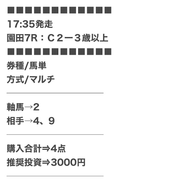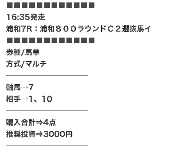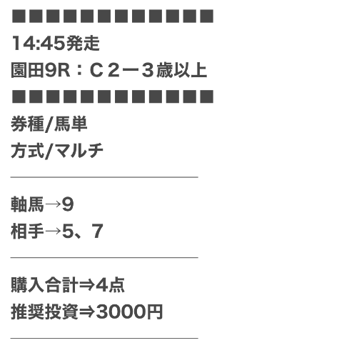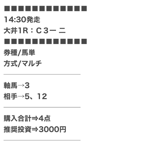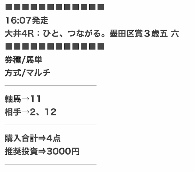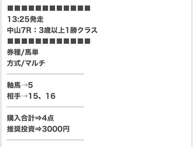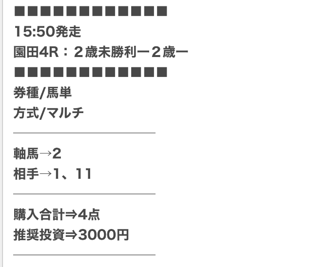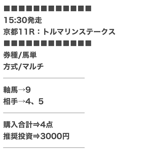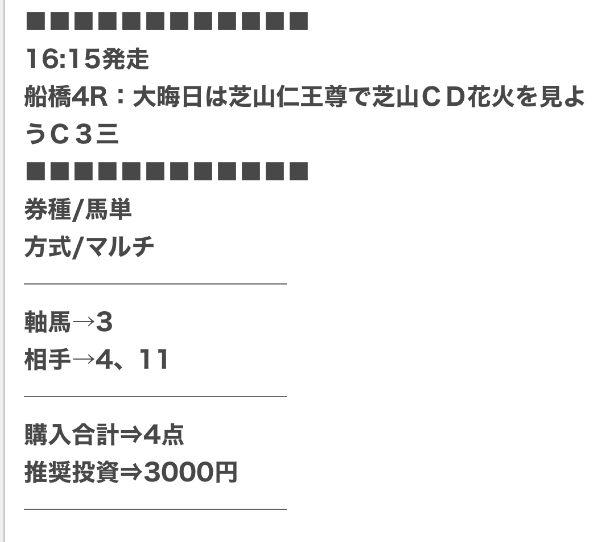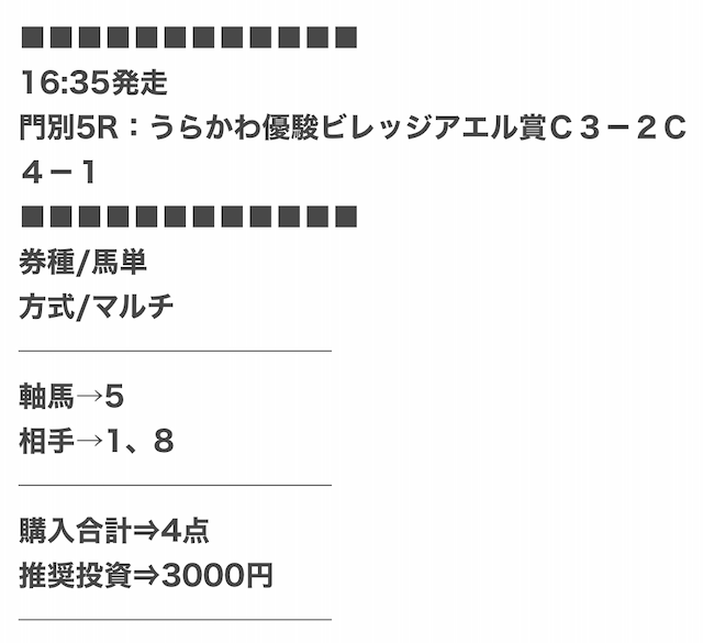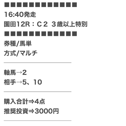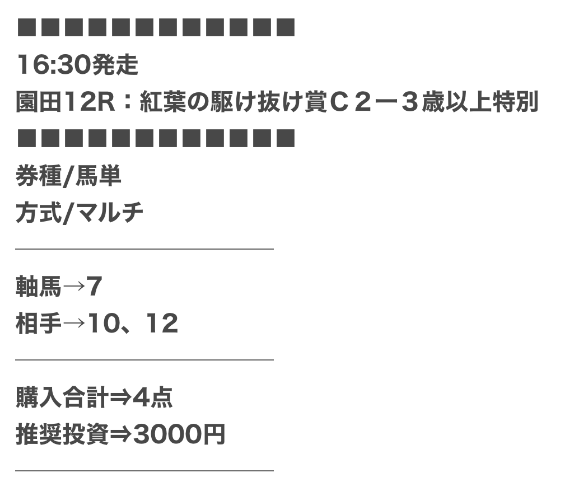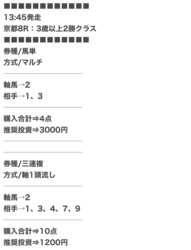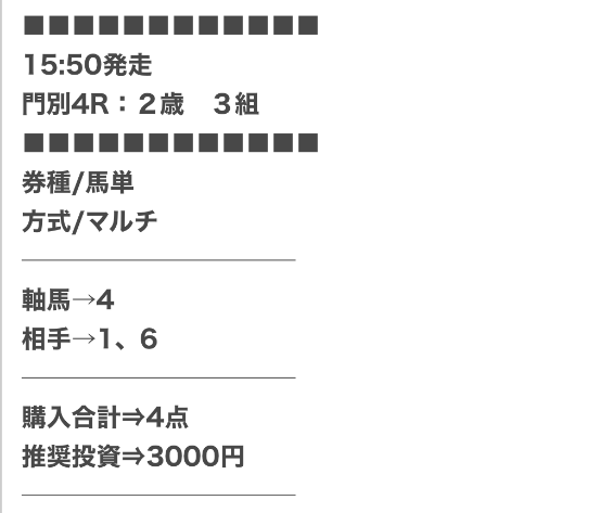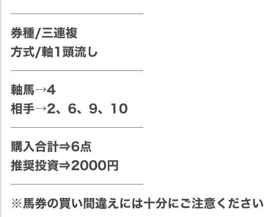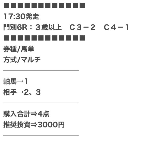 1度の参加で2鞍の買い目が公開されますが、両方的中し大満足の利益を獲得。
