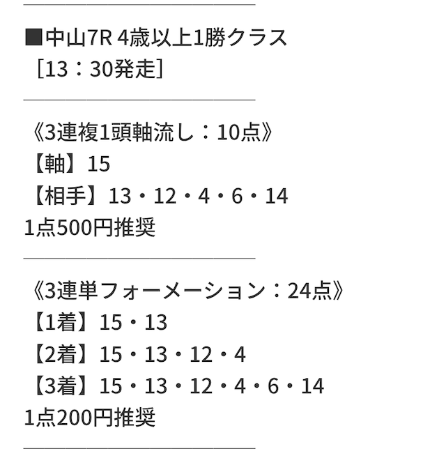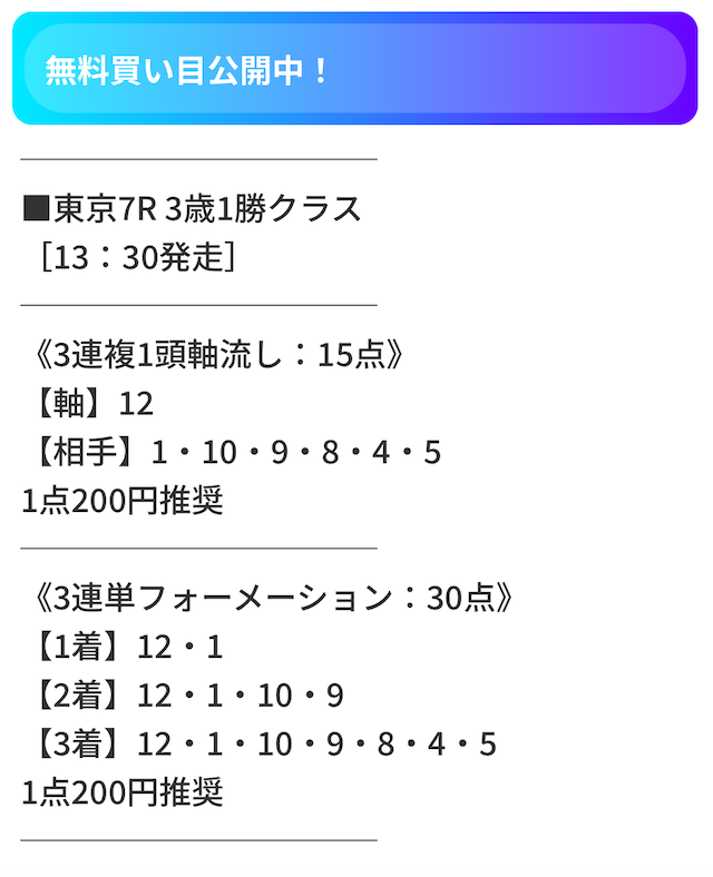 | 推奨馬券代 | 1点200円 |
