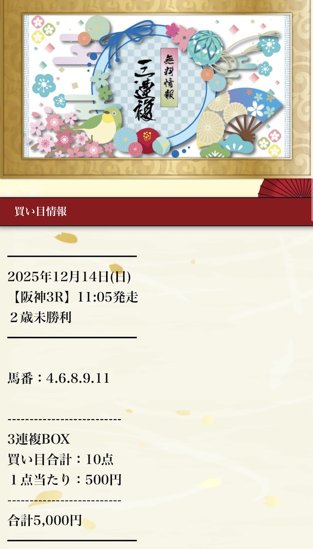 暁は、3連複の5頭ボックス10点の買い目を公開しました。