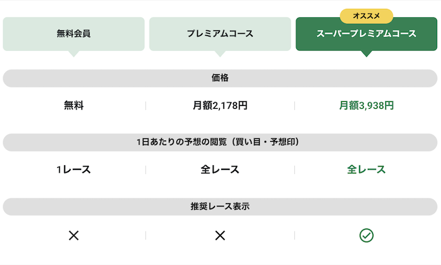 | 推奨レース表示 | 無料会員コース:× プレミアムコース:× スーパープレミアムコース:◯ |