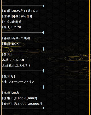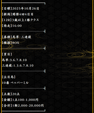 各レース馬単・3連複の2つの買い目が公開されますが、私は馬単に絞って参加してます。よく当たるし配当も文句ないからまじで使うべき。