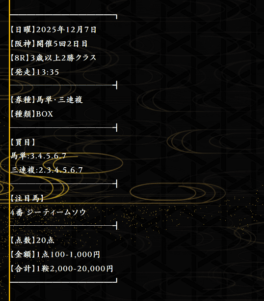 無料で極上の買い目を公開という割には3連複で堅実な予想です。利益は出るけど正直う〜んって感じ。もっと1レースでドカンと稼げる予想を公開して下さい。