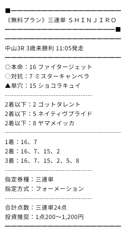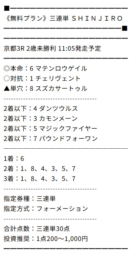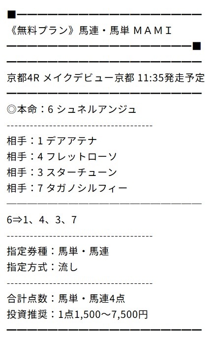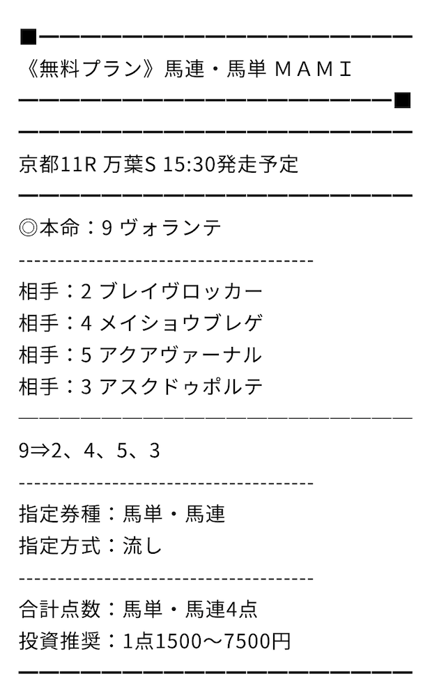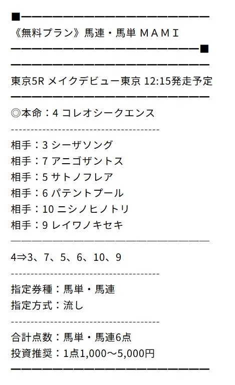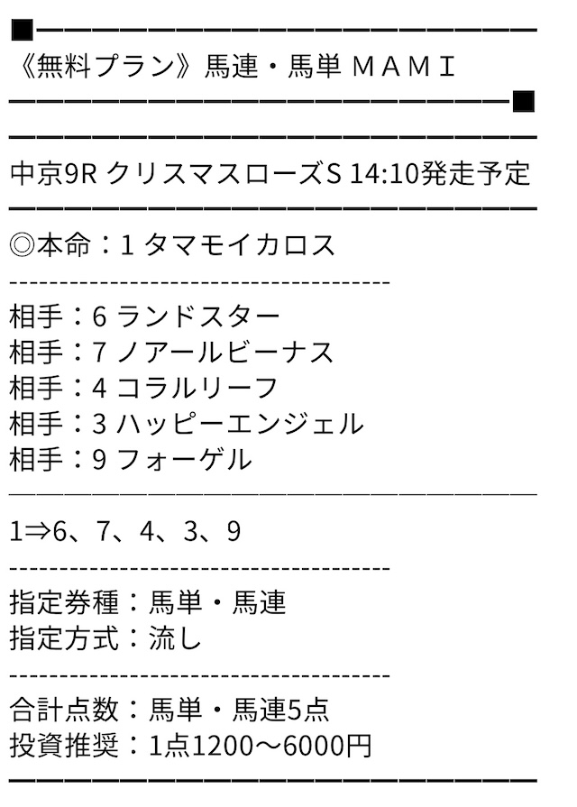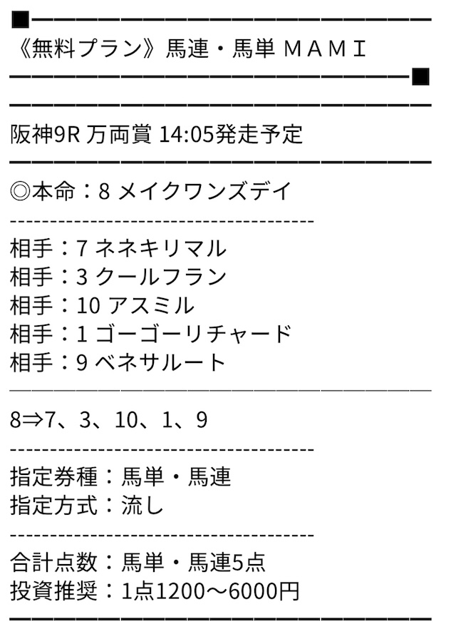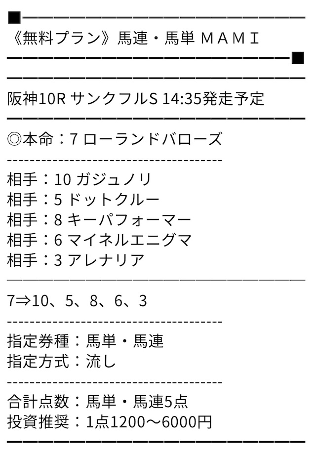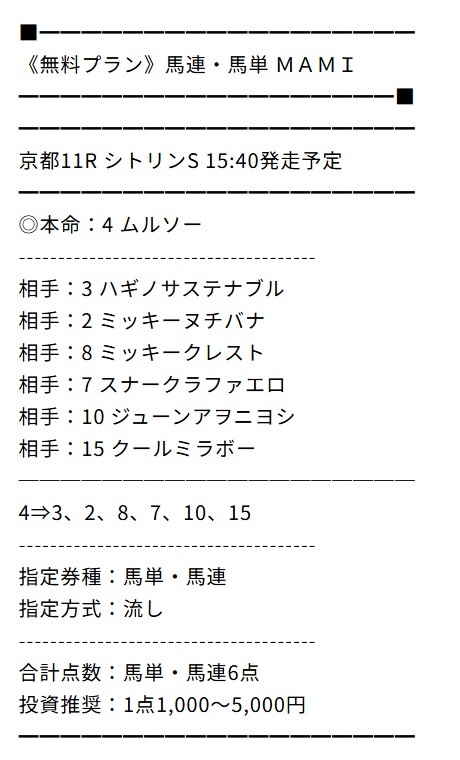 無料のMAMIには助かりました…まさかアルデラックスが二着に来るとは!先週はタダでもかなりの儲けになりましたね!今週もお願いします!
