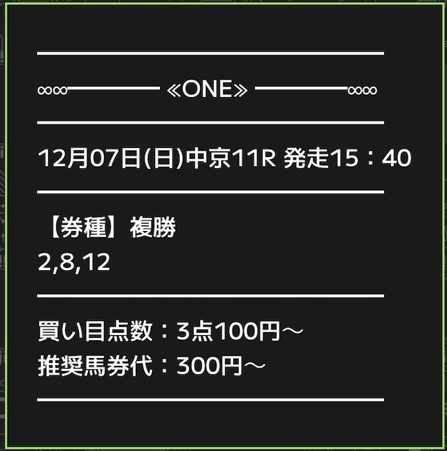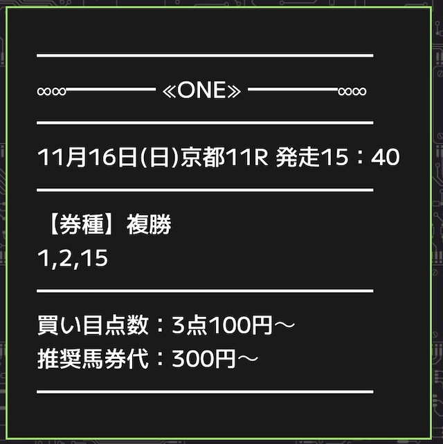 ONE(ワン)から提供された買い目と、出走する馬の詳細をご覧ください。