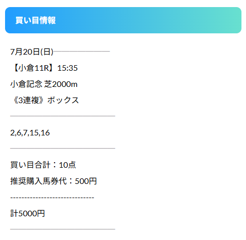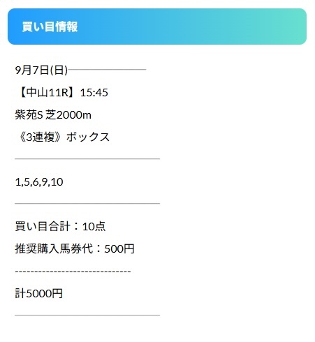 親指競馬は、3連複の5頭ボックス10点の買い目を公開。