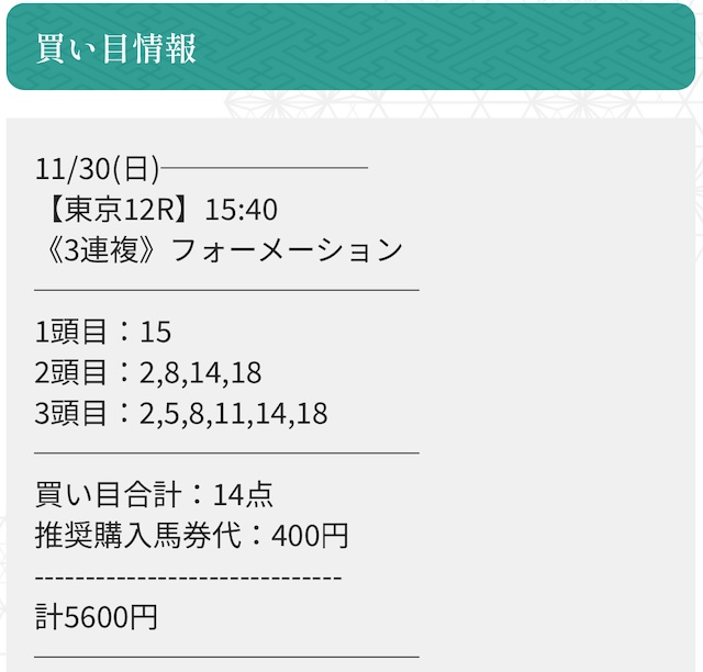 | 累計戦績 | 15戦11勝4敗 | 的中率 | 73.3% |