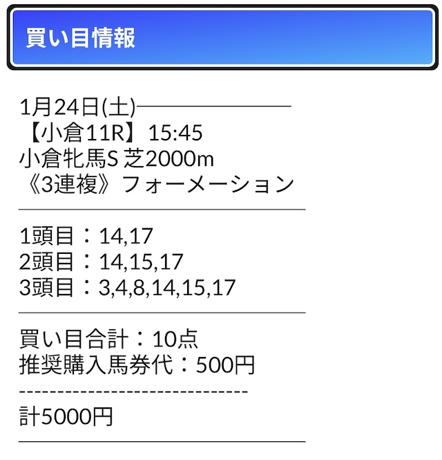 | 馬券代合計 | 5,000円 |