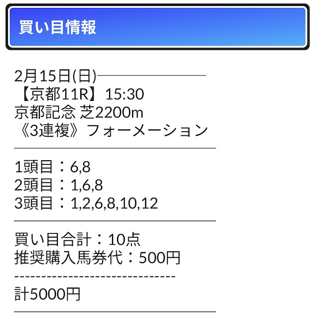 リホラボは、3連複5頭ボックス10点の買い目を公開しました。