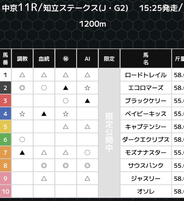 スーパー万馬券を利用する最大のメリットは、血統や血統、更にはAIといった異なるジャンルの予想印を見ることができる点。