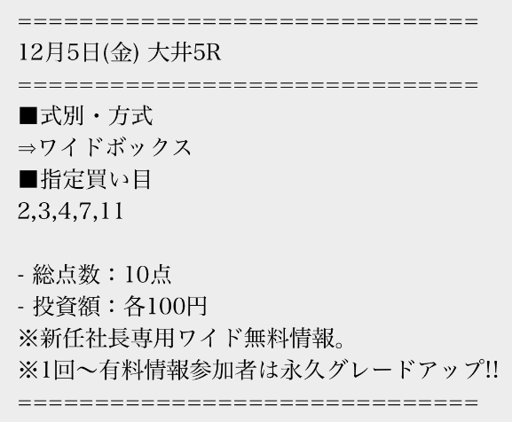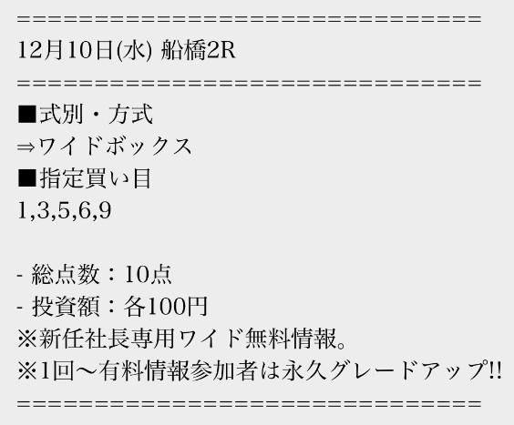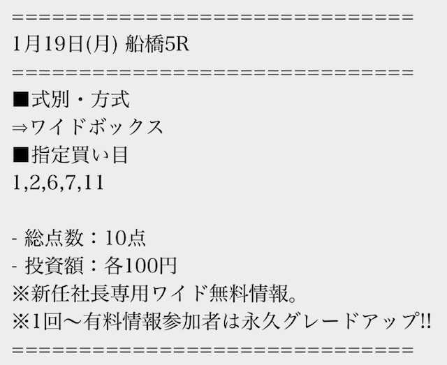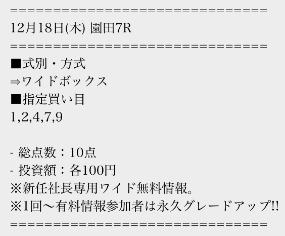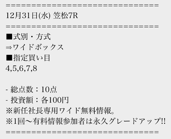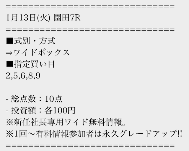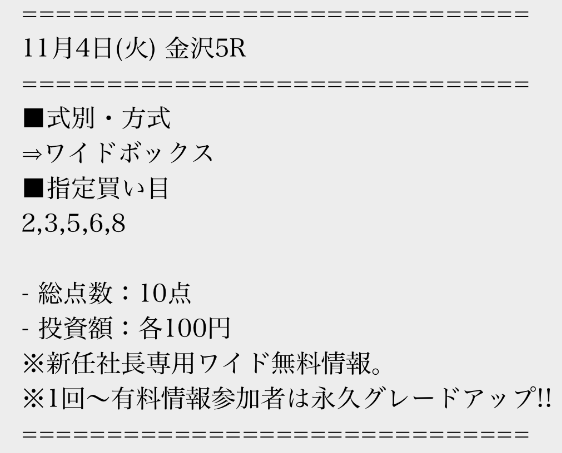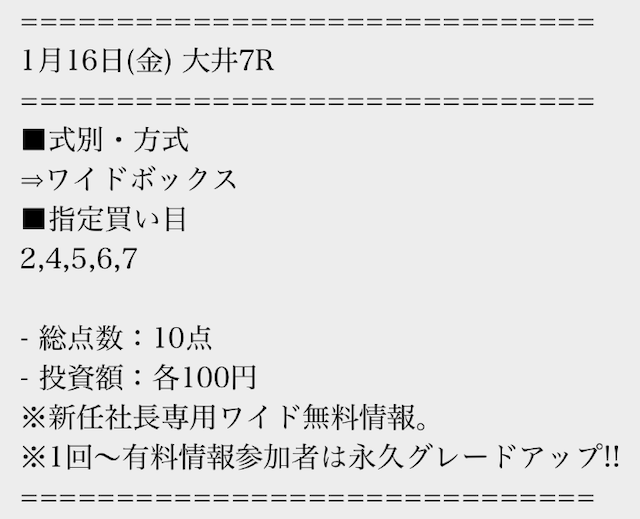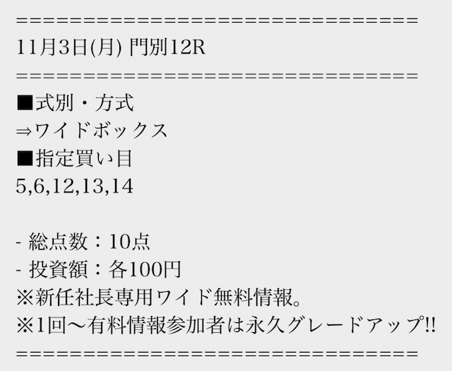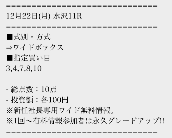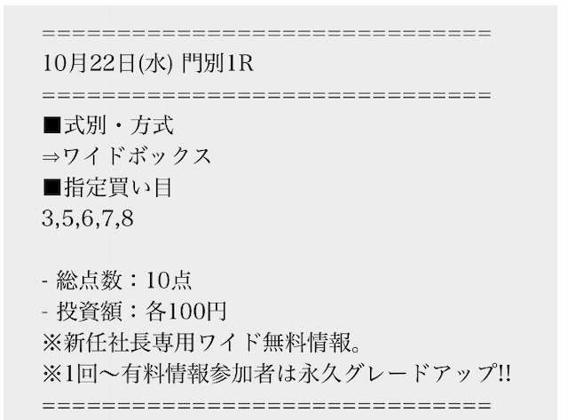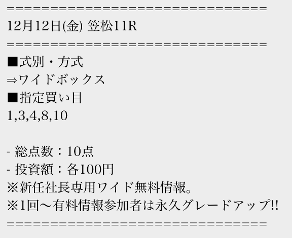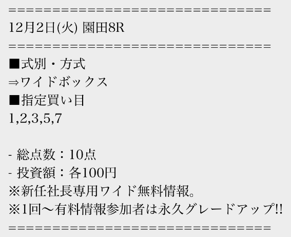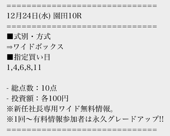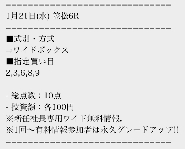 有料情報に一度参加すると、平日の無料情報が馬単に永久グレードアップされる点が魅力的ですね。最初はワイドの情報だけでも十分だと思っていましたが、やはり馬単への切り替えは大きいと感じました。無料情報が常に進化していくサービスは貴重だと思います。v