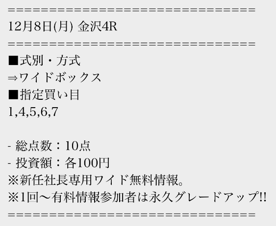 | 2025/12/8 金沢4R | 3,500円 | -6,500円 | |