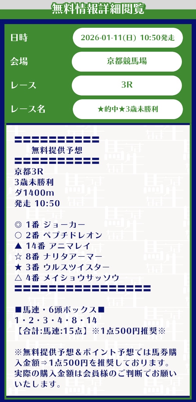 | 予想の確認方法 | 会員ページの[情報公開] |