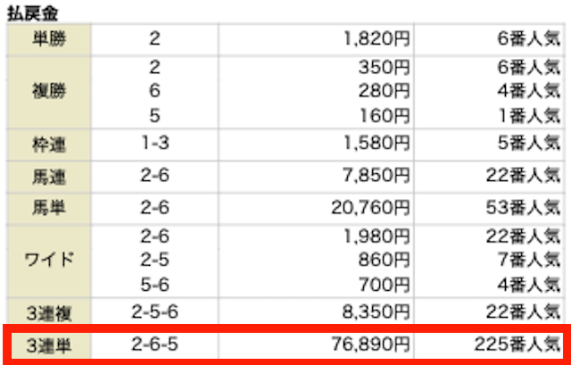 3連単には768.9倍の配当が付き、1点400円で購入していたので307,560円の払戻金を獲得。