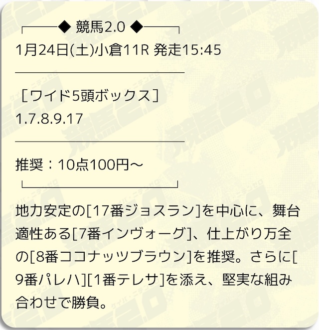 | 推奨馬券代 | 1点100円~ |